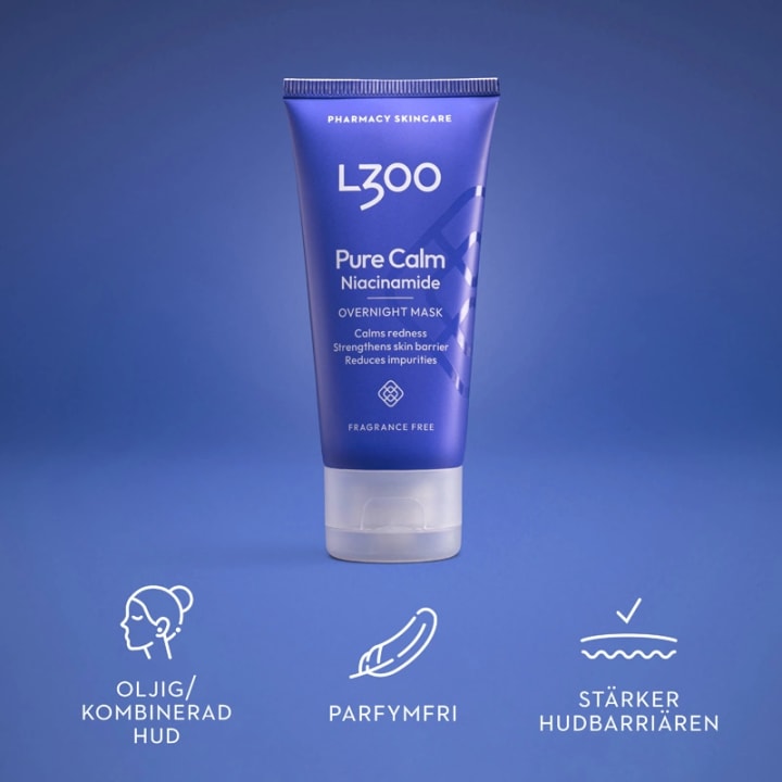 L300 Niacinamide Pure Calm Overnight Mask är en nattmask med niacinamid som motverkar orenheter, stärker hudbarriären och dämpar rödhet. Nattmasken innehåller cica (centella asiatica) som verkar lugnande samt återfuktande squalane och glycerin. Den har en krämig textur och innehåller sheasmör som bidrar till en len hud. Passar alla hudtyper, speciellt en oljig/kombinerad och känslig hudtyp. 60 ml.