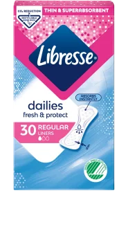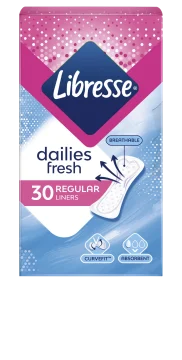 Libresse Dailies Fresh trosskydd normal är ett mjukt och absorberande trosskydd som anpassar sig efter kroppsformen. Libresse trosskydd är andningsbart och tar hand om din V-zon. Trosskydd med CurveFit är speciellt utformade för att följa din kropp och hålla sig på plats, hela dagen. Tillverkat i mjukt material. Dermatologiskt testat och utan parfym. Fäst trosskyddet i trosan med den självhäftande remsan. 30 st.