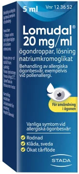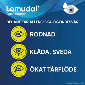 Lomudal ögondroppar används vid behandling av allergiska ögonbesvär, exempelvis ögonbesvär vid pollenallergi. Lomudal ögondroppar kan tas förebyggande men även då besvären redan börjat.Vanliga symtom vid allergiska ögonbesvär är rodnad, klåda, sveda, och ökat tårflöde. Oftast är båda ögonen irriterade. Lomudal ögondroppar motverkar den allergiska inflammationen genom att förhindra att inflammationsframkallande ämnen ex histamin frisätts i ögat.Kan användas av barn och vuxna i alla åldrar samt av gravida och ammande.Bör inte användas tillsammans med mjuka kontaktlinser. Om du har kontaktlinser, välj då istället Lomudal i endospipetter som är fri från konserveringsmedel.Lomudal är ett receptfritt läkemedel som innehåller det aktiva ämnet natriumkromoglikat. Läs bipacksedeln noga före användning.