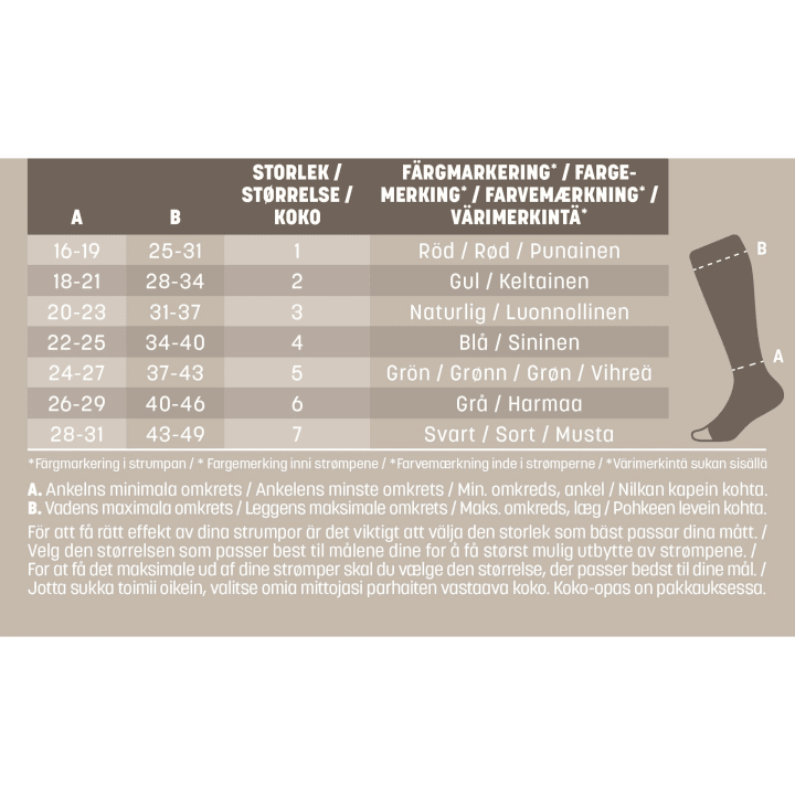 Mabs Care är en mjuk och bekväm stödstrumpa med öppen tå. Strumporna når upp till knät, är stickade i ett mjukt och bekvämt material med hög andel bomull och har kompressionsklass 1 (15–21 mmHg), som ger god komfort och ett bra stöd i vardagen. Den öppna tån gör det möjligt att inspektera foten under dagen och passar även vid problem med tårna. Du kan klippa av Mabs Care strumpan som har öppen tå, men inte de andra strumporna. Du klipper då strumpan i den övre delen för att passa längden av din vad. Vid långvarigt stillasittande eller stående kan benen och fötterna bli svullna och kännas tunga, spända och trötta. Även graviditet, övervikt och flygresor kan orsaka svullna fötter och ben. Genom att använda en kompressionsstrumpa ökar blodflödet i benen så att de känns pigga och starka hela dagen, oavsett du står går eller sitter mycket. Strumporna hjälper även till att motverka åderbråck. 1 par. Medicinteknisk produkt, läs bipacksedeln noga innan användning. Medicinska kompressionsstrumpor erbjuder kompressionsterapi med medicinsk kompression klass I som har en vetenskapligt bevisad effekt. Storleksguide: För att hitta rätt storlek mäts: 1) Omkrets runt ankeln där den är som smalast (A) 2) Omkrets runt vaden där den är som bredast (B) Storlek 1 (Röd): A 16–19 cm, B 25–31 cm, längd 31 cm Storlek 2 (Gul): A 18–21 cm, B 28–34 cm, längd 33 cm Storlek 3 (Vit): A 20–23 cm, B 31–37 cm, längd 35 cm Storlek 4 (Blå): A 22–25 cm, B 34–40 cm, längd 37 cm Storlek 5 (Grön): A 24–27 cm, B 37–43 cm, längd 39 cm Storlek 6 (Grå): A 26–29 cm, B 40–46 cm, längd 41 cm Storlek 7 (Svart): A 28–31 cm, B 43–49 cm, längd 43 cm Observera: Detta är en medicinteknisk produkt. Läs bipacksedeln före användning. Kompressionsstrumpor med klassad kompression har dokumenterad effekt och ska inte förväxlas med vanliga stödstrumpor. Mabs Care Cotton-strumpan har en markering som visar strumpans storlek i form av en färgad söm upptill på utsidan: 1 - Röd, 2 - Gul, 3 - Vit, 4 - Blå, 5 - Grön, 6 - Grå, 7 - Svart.