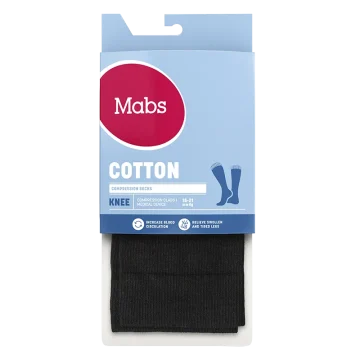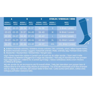 Mabs Cotton Knee är en mjuk och skön kompressionsstrumpa med en hög andel bomull för stöd i vardagen. Strumpan är stickad i ett bekvämt, hållbart OEKO-tex certifierat material och av kompressionsklass 1 (15-21 mmHg) samt har en graderad kompression som är högst vid ankeln och avtar sedan upp mot knät. Vid långvarigt stillasittande eller stående kan benen och fötterna bli svullna och kännas tunga, spända och trötta. Även graviditet, övervikt och flygresor kan orsaka svullna fötter och ben. Genom att använda en kompressionsstrumpa ökar blodflödet i benen så att de känns pigga och starka hela dagen, oavsett du står går eller sitter mycket. Strumporna hjälper även till att motverka åderbråck. 1 par. Medicinteknisk produkt, läs bipacksedeln noga innan användning. Medicinska kompressionsstrumpor erbjuder kompressionsterapi med medicinsk kompression klass I som har en vetenskapligt bevisad effekt. För att hitta din strumpstorlek och för att passformen ska bli perfekt finns det tre mått att utgå från: 1) Omkretsen runt ankeln där den är som smalast (A). 2) Omkretsen runt vaden där den är som bredast (B). 3) Din skostorlek (C). Storleksöversikt: Storlek S: Omfång ankel: 18-21 cm (A), Omfång vad: 28-34 cm (B), Skostorlek: 36-38 ( C), Strumpans längd: 33 cm Storlek M: Omfång ankel: 20-23 cm (A), Omfång vad: 31-37 cm(B), Skostorlek: 38-40 ( C), Strumpans längd: 35 cm Storlek L: Omfång ankel: 22-25 cm (A), Omfång vad: 34-40 cm(B), Skostorlek: 40-42( C) Strumpans längd: 37 cm Storlek XL: Omfång ankel: 24-27 cm (A), Omfång vad: 37-43 cm(B), Skostorlek: 43-44( C), Strumpans längd: 39 cm Storlek XXL: Omfång ankel: 26-29 cm (A), Omfång vad: 40-46 cm(B), Skostorlek: 44-47( C), Strumpans längd: 41 cm