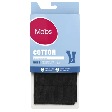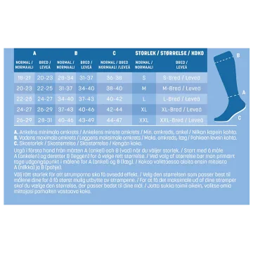 Mabs Cotton Knee är en mjuk och skön kompressionsstrumpa med en hög andel bomull för stöd i vardagen. Strumpan är stickad i ett bekvämt, hållbart OEKO-tex certifierat material och av kompressionsklass 1 (15-21 mmHg) samt har en graderad kompression som är högst vid ankeln och avtar sedan upp mot knät. Vid långvarigt stillasittande eller stående kan benen och fötterna bli svullna och kännas tunga, spända och trötta. Även graviditet, övervikt och flygresor kan orsaka svullna fötter och ben. Genom att använda en kompressionsstrumpa ökar blodflödet i benen så att de känns pigga och starka hela dagen, oavsett du står går eller sitter mycket. Strumporna hjälper även till att motverka åderbråck. 1 par. Medicinteknisk produkt, läs bipacksedeln noga innan användning. Medicinska kompressionsstrumpor erbjuder kompressionsterapi med medicinsk kompression klass I som har en vetenskapligt bevisad effekt. För att hitta din strumpstorlek och för att passformen ska bli perfekt finns det tre mått att utgå från: 1) Omkretsen runt ankeln där den är som smalast (A). 2) Omkretsen runt vaden där den är som bredast (B). 3) Din skostorlek (C). Storleksöversikt: Storlek S: Omfång ankel: 18-21 cm (A), Omfång vad: 28-34 cm (B), Skostorlek: 36-38 ( C), Strumpans längd: 33 cm Storlek M: Omfång ankel: 20-23 cm (A), Omfång vad: 31-37 cm(B), Skostorlek: 38-40 ( C), Strumpans längd: 35 cm Storlek L: Omfång ankel: 22-25 cm (A), Omfång vad: 34-40 cm(B), Skostorlek: 40-42( C) Strumpans längd: 37 cm Storlek XL: Omfång ankel: 24-27 cm (A), Omfång vad: 37-43 cm(B), Skostorlek: 43-44( C), Strumpans längd: 39 cm Storlek XXL: Omfång ankel: 26-29 cm (A), Omfång vad: 40-46 cm(B), Skostorlek: 44-47( C), Strumpans längd: 41 cm