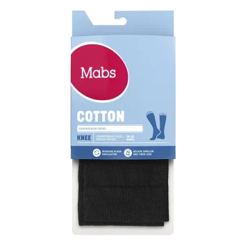 Mabs Cotton Knee är en mjuk och skön kompressionsstrumpa med en hög andel bomull för stöd i vardagen. Strumpan är stickad i ett bekvämt, hållbart OEKO-tex certifierat material och av kompressionsklass 1 (15-21 mmHg) samt har en graderad kompression som är högst vid ankeln och avtar sedan upp mot knät. Vid långvarigt stillasittande eller stående kan benen och fötterna bli svullna och kännas tunga, spända och trötta. Även graviditet, övervikt och flygresor kan orsaka svullna fötter och ben. Genom att använda en kompressionsstrumpa ökar blodflödet i benen så att de känns pigga och starka hela dagen, oavsett du står går eller sitter mycket. Strumporna hjälper även till att motverka åderbråck. 1 par. Medicinteknisk produkt, läs bipacksedeln noga innan användning. Medicinska kompressionsstrumpor erbjuder kompressionsterapi med medicinsk kompression klass I som har en vetenskapligt bevisad effekt. För att hitta din strumpstorlek och för att passformen ska bli perfekt finns det tre mått att utgå från: 1) Omkretsen runt ankeln där den är som smalast (A). 2) Omkretsen runt vaden där den är som bredast (B). 3) Din skostorlek (C). Storleksöversikt: Storlek S: Omfång ankel: 18-21 cm (A), Omfång vad: 28-34 cm (B), Skostorlek: 36-38 ( C), Strumpans längd: 33 cm Storlek M: Omfång ankel: 20-23 cm (A), Omfång vad: 31-37 cm(B), Skostorlek: 38-40 ( C), Strumpans längd: 35 cm Storlek L: Omfång ankel: 22-25 cm (A), Omfång vad: 34-40 cm(B), Skostorlek: 40-42( C) Strumpans längd: 37 cm Storlek XL: Omfång ankel: 24-27 cm (A), Omfång vad: 37-43 cm(B), Skostorlek: 43-44( C), Strumpans längd: 39 cm Storlek XXL: Omfång ankel: 26-29 cm (A), Omfång vad: 40-46 cm(B), Skostorlek: 44-47( C), Strumpans längd: 41 cm