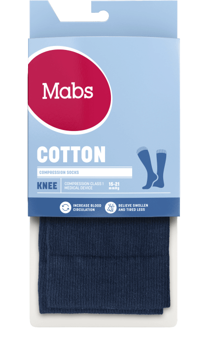 Mabs Cotton Knee Navy är en mjuk och bekväm stödstrumpa i skönt material med en hög andel bomull. Strumpan når upp till knät och har kompressionsklass 1 (15–21 mmHg) som ger god komfort och ett bra stöd i vardagen. Vid långvarigt stillasittande eller stående kan benen och fötterna bli svullna och kännas tunga, spända och trötta. Även graviditet, övervikt och flygresor kan orsaka svullna fötter och ben. Genom att använda en kompressionsstrumpa ökar blodflödet i benen så att de känns pigga och starka hela dagen, oavsett du står går eller sitter mycket. Strumporna hjälper även till att motverka åderbråck. 1 par. Medicinteknisk produkt, läs bipacksedeln noga innan användning. Medicinska kompressionsstrumpor erbjuder kompressionsterapi med medicinsk kompression klass I som har en vetenskapligt bevisad effekt. För att välja rätt storlek och för att passformen ska bli perfekt finns det tre mått att utgå från: 1) Omkretsen runt ankeln där den är som smalast (A). 2) Omkretsen runt vaden där den är som bredast (B). 3) Din skostorlek (C). Storleksöversikt: • Storlek S: Omfång ankel: 18–21 cm (A), Omfång vad: 28–34 cm (B), Skostorlek: 36–38 (C), Strumpans längd: 33 cm • Storlek M: Omfång ankel: 20–23 cm (A), Omfång vad: 31–37 cm(B), Skostorlek: 38–40 (C), Strumpans längd: 35 cm • Storlek L: Omfång ankel: 22–25 cm (A), Omfång vad: 34–40 cm(B), Skostorlek: 40–42 (C) Strumpans längd: 37 cm • Storlek XL: Omfång ankel: 24–27 cm (A), Omfång vad: 37–43 cm(B), Skostorlek: 43–44 (C), Strumpans längd: 39 cm • Storlek XXL: Omfång ankel: 26–29 cm (A), Omfång vad: 40–46 cm(B), Skostorlek: 44-47 (C), Strumpans längd: 41 cm Hittar du inte en storlek som passar dig så finns Mabs Cotton även som Bred modell.