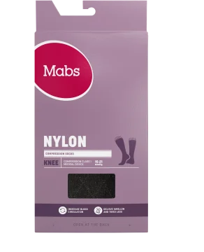 Mabs Nylon Knee Design Black är en tunn och elegant stödstrumpa med ett snyggt och trendigt mönster. Passar perfekt för festligare tillfällen eller för ett lite mer uppklätt intryck till vardags. Nylonstrumporna motverkar svullnad i benen utan att kompromissa med stilen på kontoret, på fritiden eller på festen. Strumporna når upp till knät och är stickade i en bekvämt nylonmaterial som motsvarar 140 denier och har kompressionsklass 1 (15–21 mmHg) som ger god komfort och ett bra stöd i vardagen. Vid långvarigt stillasittande eller stående kan benen och fötterna bli svullna och kännas tunga, spända och trötta. Även graviditet, övervikt och flygresor kan orsaka svullna fötter och ben. Genom att använda en kompressionsstrumpa ökar blodflödet i benen så att de känns pigga och starka hela dagen, oavsett du står går eller sitter mycket. Strumporna hjälper även till att motverka åderbråck. 1 par. Medicinteknisk produkt, läs bipacksedeln noga innan användning. Medicinska kompressionsstrumpor erbjuder kompressionsterapi med medicinsk kompression klass I som har en vetenskapligt bevisad effekt. För att välja rätt storlek och för att passformen ska bli perfekt finns det tre mått att utgå från: 1) Omkretsen runt ankeln där den är som smalast (A). 2) Omkretsen runt vaden där den är som bredast (B). 3) Din skostorlek (C). Storleksöversikt: • Storlek S: Omfång ankel: 18-21 cm (A), Omfång vad: 28-34 cm (B), Skostorlek: 36-38 ( C), Strumpans längd: 32 cm • Storlek M: Omfång ankel: 20-23 cm (A), Omfång vad: 31-37 cm (B), Skostorlek: 38-40 ( C), Strumpans längd: 34 cm • Storlek L: Omfång ankel: 22-25 cm (A), Omfång vad: 34-40 cm (B), Skostorlek: 40-42( C) Strumpans längd: 36 cm • Storlek XL : Omfång ankel: 24-27 cm (A), Omfång vad: 37-43 cm (B), Skostorlek: 42-44( C), Strumpans längd: 38 cm Hittar du inte en storlek som passar dig så finns Mabs Nylon även som Bred modell.