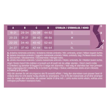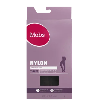 Mabs Nylon tight är mjuka och bekväma strumpbyxor med kompression vilket ökar blodflödet i benen något som i sin tur motverkar trötthet, svullnad och åderbråck. Strumpbyxorna är stickad i ett bekvämt, hållbart OEKO-texcertifierat material och av kompressionsklass 1 (15-21 mmHg), 140 denier. Dom har en slät stickning och finish för en elegant look som passar både på kontoret som på fritiden. Vid långvarigt stillasittande eller stående kan benen och fötterna bli svullna och kännas tunga, spända och trötta. Även graviditet, övervikt och flygresor kan orsaka svullna fötter och ben. Genom att använda en kompressionsstrumpa ökar blodflödet i benen så att de känns pigga och starka hela dagen, oavsett du står går eller sitter mycket. Strumporna hjälper även till att motverka åderbråck. 1 par. Medicinteknisk produkt, läs bipacksedeln noga innan användning. Medicinska kompressionsstrumpor erbjuder kompressionsterapi med medicinsk kompression klass I som har en vetenskapligt bevisad effekt. För att hitta din strumpstorlek och för att passformen skall bli perfekt finns det tre mått du bör utgå från: 1) Omkretsen runt ankeln där den är som smalast (A). 2) Omkretsen runt vaden där den är som bredast (B). 3) Din skostorlek (C). Lårets maximala omfång (D). Storleksöversikt: Storlek S: Omfång ankel: 18-21 cm (A), Omfång vad: 28-34 cm (B), Skostorlek: 36-38 ( C), Lårets max omf: 44-55(D), Strumpans längd: 80 cm Storlek M: Omfång ankel: 20-23 cm (A), Omfång vad: 31-37 cm (B), Skostorlek: 38-40 ( C),Lårets max omf: 48-56(D) Strumpans längd: 85 cm Storlek L: Omfång ankel: 22-25 cm (A), Omfång vad: 34-40 cm (B), Skostorlek: 40-42( C), Lårets max omf: 52-60(D) Strumpans längd: 90 cm