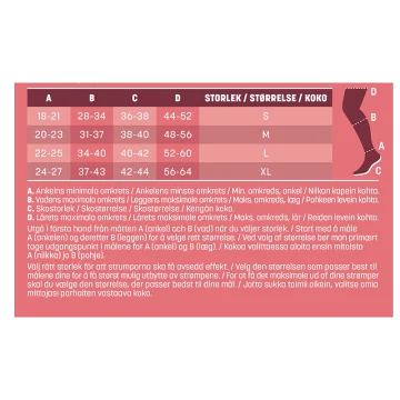 Mabs Nylon Tights Pregnant är en mjuk och skön gravidstrumbyxa som har kompressionsklass 1 (15-21 mmHg), 140 denier. Tillverkad i ett bekvämt hållbart OEKO-texcertifierat material och har en slät stickning för en elegant look och mjuk finish. Under graviditet är det vanligt att få svullna, trötta ben och åderbråck genom att använda stödstrumpor förebygger du dessa problem innan dom dyker upp. Genom att använda en kompressionsstrumpa ökar blodflödet i benen så att de känns pigga och starka hela dagen, oavsett du står går eller sitter mycket. Strumporna hjälper även till att motverka åderbråck. 1 par. Medicinteknisk produkt, läs bipacksedeln noga innan användning. Medicinska kompressionsstrumpor erbjuder kompressionsterapi med medicinsk kompression klass I som har en vetenskapligt bevisad effekt. För att välja rätt storlek och för att passformen ska bli perfekt finns det tre mått att utgå från: 1) Omkretsen runt ankeln där den är som smalast (A). 2) Omkretsen runt vaden där den är som bredast (B). 3) Din skostorlek (C). Lårets maximala omfång (D). Storleksöversikt: Storlek S: Omfång ankel: 18-21 cm (A), Omfång vad: 28-34 cm (B), Skostorlek: 36-38 ( C), Lårets max omf: 44-55(D) Storlek M: Omfång ankel: 20-23 cm (A), Omfång vad: 31-37 cm (B), Skostorlek: 38-40 ( C),Lårets max omf: 48-56(D) Storlek L: Omfång ankel: 22-25 cm (A), Omfång vad: 34-40 cm (B), Skostorlek: 40-42( C), Lårets max omf: 52-60(D) Storlek XL : Omfång ankel: 24-27 cm (A), Omfång vad: 37-43 cm (B), Skostorlek: 42-44( C), Lårets max omf: 56-64(D)