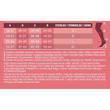 Mabs Nylon Tights Pregnant är en mjuk och skön gravidstrumbyxa som har kompressionsklass 1 (15-21 mmHg), 140 denier. Tillverkad i ett bekvämt hållbart OEKO-texcertifierat material och har en slät stickning för en elegant look och mjuk finish. Under graviditet är det vanligt att få svullna, trötta ben och åderbråck genom att använda stödstrumpor förebygger du dessa problem innan dom dyker upp. Genom att använda en kompressionsstrumpa ökar blodflödet i benen så att de känns pigga och starka hela dagen, oavsett du står går eller sitter mycket. Strumporna hjälper även till att motverka åderbråck. 1 par. Medicinteknisk produkt, läs bipacksedeln noga innan användning. Medicinska kompressionsstrumpor erbjuder kompressionsterapi med medicinsk kompression klass I som har en vetenskapligt bevisad effekt. För att välja rätt storlek och för att passformen ska bli perfekt finns det tre mått att utgå från: 1) Omkretsen runt ankeln där den är som smalast (A). 2) Omkretsen runt vaden där den är som bredast (B). 3) Din skostorlek (C). Lårets maximala omfång (D). Storleksöversikt: Storlek S: Omfång ankel: 18-21 cm (A), Omfång vad: 28-34 cm (B), Skostorlek: 36-38 ( C), Lårets max omf: 44-55(D) Storlek M: Omfång ankel: 20-23 cm (A), Omfång vad: 31-37 cm (B), Skostorlek: 38-40 ( C),Lårets max omf: 48-56(D) Storlek L: Omfång ankel: 22-25 cm (A), Omfång vad: 34-40 cm (B), Skostorlek: 40-42( C), Lårets max omf: 52-60(D) Storlek XL : Omfång ankel: 24-27 cm (A), Omfång vad: 37-43 cm (B), Skostorlek: 42-44( C), Lårets max omf: 56-64(D)
