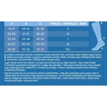 Mabs Thin Cotton Knee Black är en mjuk och bekväm stödstrumpa i tunt bomullsmaterial. Strumpan når upp till knät och har kompressionsklass 1 (15–21 mmHg) som ger god komfort och ett bra stöd i vardagen. De tunnare bomullsstrumporna passar extra bra för personer med varma fötter eller personer som upplever att vanliga stödstrumpor kan vara svåra att ta på. Vid långvarigt stillasittande eller stående kan benen och fötterna bli svullna och kännas tunga, spända och trötta. Även graviditet, övervikt och flygresor kan orsaka svullna fötter och ben. Genom att använda en kompressionsstrumpa ökar blodflödet i benen så att de känns pigga och starka hela dagen, oavsett du står går eller sitter mycket. Strumporna hjälper även till att motverka åderbråck. 1 par. Medicinteknisk produkt, läs bipacksedeln noga innan användning. Medicinska kompressionsstrumpor erbjuder kompressionsterapi med medicinsk kompression klass I som har en vetenskapligt bevisad effekt. För att välja rätt storlek och för att passformen ska bli perfekt finns det tre mått att utgå från: 1) Omkretsen runt ankeln där den är som smalast (A). 2) Omkretsen runt vaden där den är som bredast (B). 3) Din skostorlek (C). Storleksöversikt: • Storlek S: Omfång ankel: 18-21 cm (A), Omfång vad: 28-34 cm (B), Skostorlek: 36-38 ( C), Strumpans längd: 33 cm • Storlek M: Omfång ankel: 20-23 cm (A), Omfång vad: 31-37 cm(B), Skostorlek: 38-40 ( C), Strumpans längd: 36 cm • Storlek L: Omfång ankel: 22-25 cm (A), Omfång vad: 34-40 cm(B), Skostorlek: 40-42( C) Strumpans längd: 39,5 cm • Storlek XL: Omfång ankel: 24-27 cm (A), Omfång vad: 37-43 cm(B), Skostorlek: 43-44( C), Strumpans längd: 43,5 cm • Storlek XXL: Omfång ankel: 26-29 cm (A), Omfång vad: 40-46 cm(B), Skostorlek: 44-47( C), Strumpans längd: 47 cm