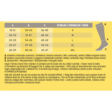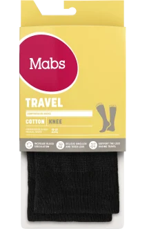 Mabs Travel Cotton är en mjuk och bekväm stödstrumpa i skönt material med hög andel bomull och kompressionsklass 1 (15–21 mmHg). Strumporna är speciellt framtagna för att ge god komfort och ett bra stöd under resor och längre perioder av stillasittande. Det extra tunna materialet passar även personer som tycker att vanliga stödstrumpor är svåra att ta på. Strumporna når upp till knät och har en behaglig mudd upptill så att de sitter bekvämt över vaden. Vid långvarigt stillasittande eller stående kan benen och fötterna bli svullna och kännas tunga, spända och trötta. Det gäller alltså inte bara vid långa flygresor, utan även vid längre bil- och tågresor. Genom att använda en kompressionsstrumpa ökar blodflödet i benen så att de känns pigga och starka under hela resan. 1 par. Medicinteknisk produkt, läs bipacksedeln noga innan användning. Medicinska kompressionsstrumpor erbjuder kompressionsterapi med medicinsk kompression klass I som har en vetenskapligt bevisad effekt. För att välja rätt storlek och för att passformen ska bli perfekt finns det tre mått att utgå från: 1) Omkretsen runt ankeln där den är som smalast (A). 2) Omkretsen runt vaden där den är som bredast (B). 3) Din skostorlek (C). Storleksöversikt: • Storlek S: Omfång ankel: 18-21 cm (A), Omfång vad: 28-34 cm (B), Skostorlek: 36-38 ( C), Strumpans längd: 33 cm • Storlek M: Omfång ankel: 20-23 cm (A), Omfång vad: 31-37 cm(B), Skostorlek: 38-40 ( C), Strumpans längd: 36 cm • Storlek L: Omfång ankel: 22-25 cm (A), Omfång vad: 34-40 cm(B), Skostorlek: 40-42( C), Strumpans längd: 39,5 cm • Storlek XL: Omfång ankel: 24-27 cm (A), Omfång vad: 37-43 cm(B), Skostorlek: 43-44( C), Strumpans längd: 43,5 cm • Storlek XXL: Omfång ankel: 26-29 cm (A), Omfång vad: 40-46 cm(B), Skostorlek: 44-47( C), Strumpans längd: 47 cm