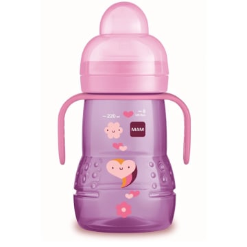 MAM Trainer är en flaska med handtag för att bebisen lätt ska kunna greppa flaskan själv. Med en extra mjuk och spillfri drickpip i silikon. Flaskan är en bra övergång från amning eller nappflaska till mugg. Läckagesäkert lock som även kan användas som mått. Enkel att hålla i och perfekt att ta med sig i väskan. BPA-fri. Rekommenderas från 4 månader. Välj mellan olika färger. 220 ml. Motivet på nappflaskorna i vald färg varierar och skickas slumpmässigt.