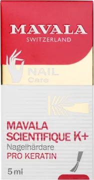 Mavala Scientifique K+ är en nagelhärdare. Den motverkar att naglarna skivar sig. Har du problem med tunna naglar som lätt går sönder kan det här vara rätt produkt för dig. Den innehåller pro-kreatin och resin som får fibrerna i naglarna att hålla ihop. Den kan användas under vanligt nagellack. Produkten är fri från formaldehyd. 5 ml.
