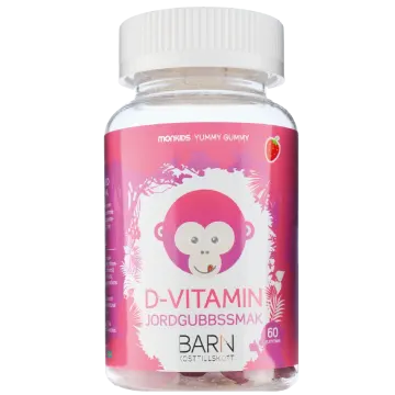 Monkids D-vitamin Barn Jordgubb är ett kosttillskott för barn med D-vitamin. Monkids D-vitamin är välsmakande och lättuggade tuggisar med naturlig jordgubbssmak. D-vitamin bidrar till ett normalt fungerande immunsystem. De svensktillverkade tuggisarnas fina färg kommer från blåbär och morot. Från 3 år. 60 st.