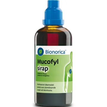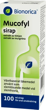 Mucofyl Sirap är ett växtbaserat läkemedel som används vid slemhosta. Mucofyl Sirap innehåller extrakt från timjan och murgröna som har en slemlösande effekt, vilket lindrar hostan och minskar hostattackerna. Om symtomen kvarstår längre än en vecka under användningen av Mucofyl bör du konsultera läkare eller apotekspersonal. Mucofyl Sirap har en naturlig söt smak och kan användas av vuxna och barn från 2 år. 100 ml.