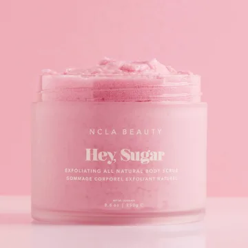 NCLA Beauty Hey, Sugar Body Scrub Pink Champagne är en återfuktande och skonsamt exfolierande kroppsskrubb. Berikad med sheasmör, kokossmör och mangofröolja som verkar återfuktande. Passar torr hud. Med en doft av rosa champagne. 250 g.