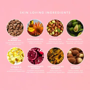 Prunus Amygdalus Dulcis (Sweet Almond) Oil, Carthamustinctorius (Safflower) Seed Oil, Fragrance (Perfume, Persea Gratissima (Avocado) Oil, Simmondsia Chinensis (Jojoba) Seed Oil, Tocopheryl Acetate (Vitamin E), Punica Granatum (Pomegranate) Fruit Extract, Helianthus Annuus (Sunflower) Seed Oil, Calendula Officinalis Extract, Theobroma Grandiflorum (Cupuacu) Fruit Extract. ALLERGENS ABOVE 0.001%: Benzyl Salicylate, Coumarin, D-Limonene, Eugenol, Geraniol, Hexyl Cinnamic Aldehyde, Hydroxycitronellal, Linalool, Methyl lonone Gamma