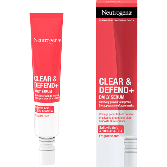 Neutrogena Clear & Defend+ Daily Serum är ett ansiktsserum för oren och fet hy. Berikat med en kraftfull kombination av BHA-syra, AHA-syra och PHA-syra. Salicylsyra rengör huden på djupet för att minska uppkomsten av finnar, AHA-syra exfolierar huden och hjälper den att minska synligheten av märken från tidigare orenheter och PHA-syra rensar porerna och bidrar till en känsla av jämnare och slätare hud. Serumet har en lätt formula som absorberas snabbt i huden och inte täpper till porerna. Oparfymerad. 30 ml.