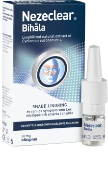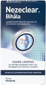 Nezeclear Nässpray Bihåla ger snabb lindring av vanliga bihålebesvär så som smärta i ansikte och nästäppa. En naturlig behandling av akut eller kronisk bihåleinflammation (rhinosinusit) med kliniskt dokumenterad effekt. Nezeclear Bihåla innehåller inte antibiotika eller kortison och kan användas från 12 år.