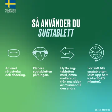 Behandlingen är avsedd för vuxna över 18 år. Placera en sugtablett i munnen och flytta sugtabletten med jämna mellanrum från den ena sidan av munnen till den andra tills dess att sugtabletten lösts upp helt. Sugtabletten ska inte tuggas eller sväljas. Nicorette Frukt 2 mg sugtabletter är lämpliga för rökare med ett lågt nikotinberoende, t.ex. de som röker dagens första cigarett mer än 30 minuter efter uppvaknandet eller röker högst 20 cigaretter om dagen. Max dos är 15 sugtabletter om dagen (24 timmar). Läs alltid bipacksedel innan användningen.