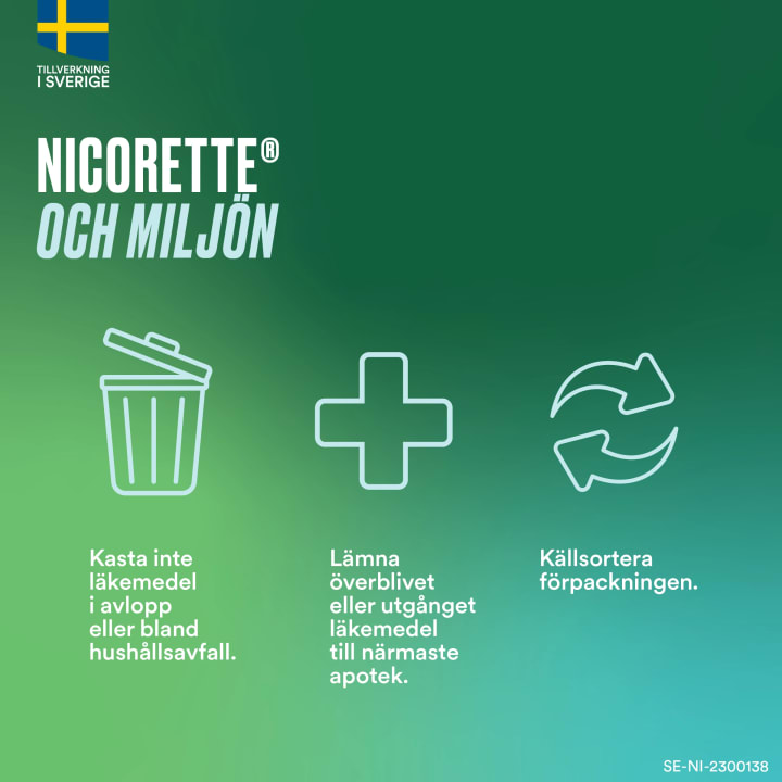Tuggummi med nikotin. Tugga bort röksuget. Kliniskt bevisat att lindra röksuget. Sockerfri. Med smak av mentolmint. Receptfritt nikotinläkemedel som minskar röksug, underlättar nedtrappning och lindrar abstinensbesvär. Kombinationsbehandling: kan kombineras med Nicorette® Novum depotplåster.