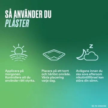 För vuxna (över 18 år): 1 plåster (25 mg) dagligen om du röker mer än 20 cigaretter/dag. Sätt på plåstret när du vaknar på morgonen och ta av det efter ca 16 timmar innan du går och lägger dig på kvällen. Du kan bada och duscha som vanligt. För att minimera risken för lokal irritation bör placeringen av plåstret alterneras mellan olika applikationsställen. Tvätta händerna noggrant efter applicering av plåstret. Läs alltid bipacksedel innan användningen.