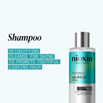 Nioxin Age Defense Shampoo är ett anti-age-schampo som bidrar till att främja ett fylligare och glansigare hår. Formulan med Nutractive+ Complex och niacinamid bidrar till att stärka hårbottens hälsa och avlägsna produktrester och orenheter. Schampot är dermatologiskt testat, skonsamt för färgbehandlat hår och milt nog för daglig användning på alla hårtyper. Fri från sulfater, silikoner och parabener för att bevara hårets färg och lyster. Håret lämnas med en ren känsla, naturlig glans och fyllighet. 240 ml.