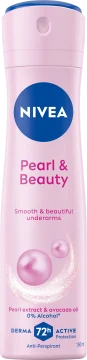 Nivea Deo Spray Pearl & Beauty är en antiperspirant spray som ger upp till 72 timmars skydd mot svett och lukt. Formulan innehåller pärlextrakt och avokadoolja som bidrar till att vårda huden och lämna den slät och mjuk. Produkten är fri från etylalkohol och har en blommig doft som håller länge. Dermatologiskt testad och passar alla hudtyper. 150 ml