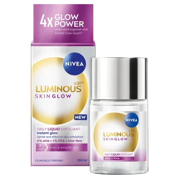Nivea Exfoliator Luminous630 Skin Glow Daily Liquid är en leave-on peeling som ger en förnyad hy med lyster. Berikad med 4% AHA och 1% PHA som skonsamt exfolierar huden, minimerar porer och jämnar ut hudtexturen. Den innehåller även aloe vera som ger en mjuk hud. Den lätta formulan absorberas snabbt in i huden och passar alla hudtyper, även känslig hud. 100 ml.