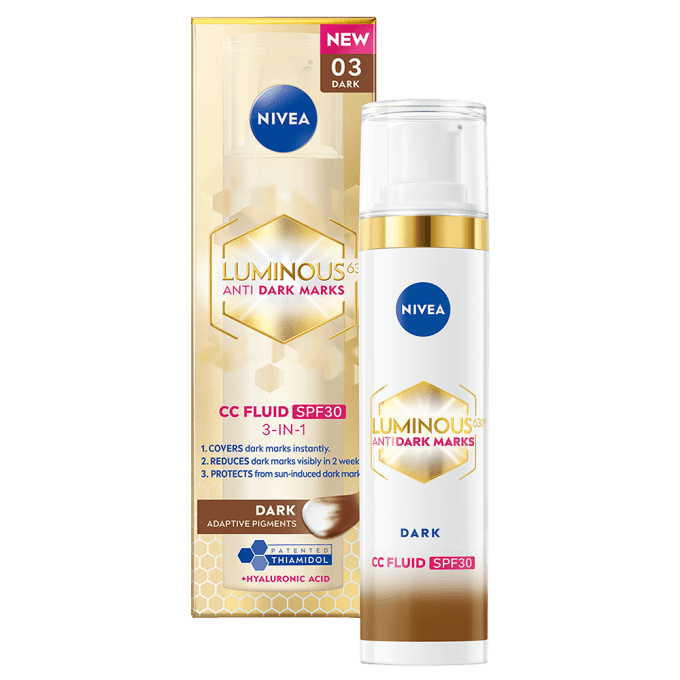 Nivea Luminous 630 Anti Dark-Spot CC Fluid 3-in-1 är en färgad dagkräm som jämnar ut hudtonen, vårdar huden och skyddar mot solens skadliga UVA- och UVB-strålar med SPF 30. Krämen innehåller mikroinkapslade pigment som anpassar sig efter hudtonen och ger en lätt täckning som suddar ut ojämnheter och pigmenteringar med en naturlig finish. Berikad med thiamidol som vårdar huden, hjälper till att reducera mörka fläckar och bidrar till en jämnare hudton. Finns i tre nyanser som passar de flesta hudtoner. Passar alla hudtyper, även känslig hy. 40 ml.