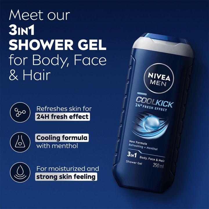 Nivea Men Cool Kick Shower Gel är en uppfriskande och vårdande duschgel för män. Innehåller mentol som ger en uppfriskande och svalkande känsla i duschen. Kan användas på kroppen, i ansiktet och i håret. Mild och effektiv formula med en fräsch och maskulin doft. 250 ml.