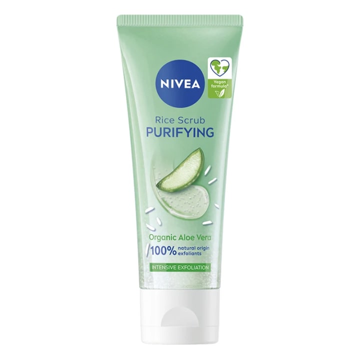 Nivea Purify Rice Scrub exfolierar intensivt och rengör huden från döda hudceller och orenheter. Ansiktsskrubb med exfolieringskorn från Japonica risfrön som krossats och blandats med aloe vera som återfuktar huden. Innehåller även tapioca som har en mattande effekt. Skrubben har hög intensitet som passar kombinerad och oljig hud. 75 ml.