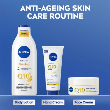 Nivea Q10 Anti-Age Hand Cream är en handkräm som verkar djupt återfuktande och ger skydd mot yttre påfrestningar. Formulan är berikad med Q10 och UV-filter som tillsammans bidrar till att minska synligheten av rynkor, förbättra hudens elasticitet och skydda händerna mot tecken på åldrande. Krämen absorberas snabbt in i huden utan att kännas kladdig och stödjer hudens naturliga barriär för långvarig vård och skydd. Passar för daglig användning. Dermatologiskt testad. 100 ml.