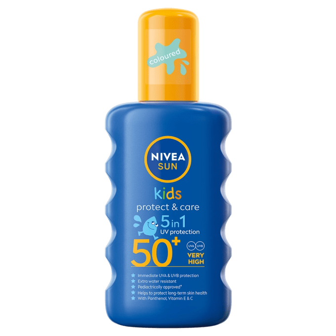 Nivea Sun Protect & Care Kids Sun Spray SPF 50+ är en solspray för barn med mycket högt solskydd. Solkrämen skyddar mot solens skadliga UVA- och UVB-strålar och är speciellt framtagen för att skydda barns känsliga hud. Berikad med pantenol, vitamin E och vitamin C som återfuktar och skyddar huden. Krämen absorberas snabbt, är extra vattenresistent och passar perfekt för aktiva barn som leker utomhus och vid bad. 200 ml.