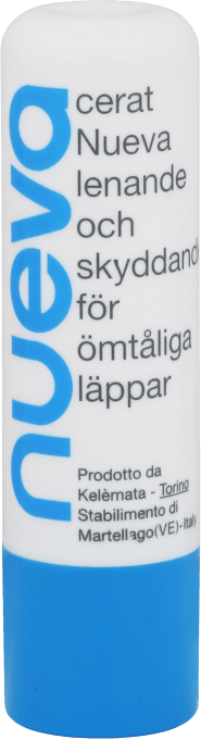 Cerat Nueva är ett lenande och skyddande cerat. Paraffin och lanolin gör läpparna lena och mjuka samt motståndskraftiga mot uttorkande kyla och sol. Även lämplig för ömtåliga läppar. Använd vid behov. Fetthalt 100%. 4,65 g.