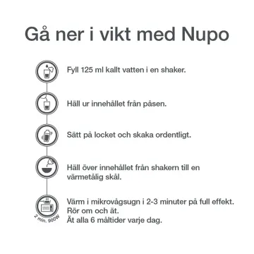 Tillsätt 125 ml vatten och 1 påse Nupo i en shaker. Skaka ordentligt och häll i en skål. Värm i ca. 2 minuter i mikrovågsugn. Kan också värmas i en gryta. Rör om och låt stå 5 min. Njut av alla 6 portioner per dag. Det är viktigt att följa bruksanvisningen.