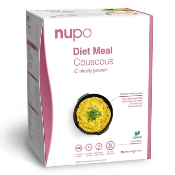Nupo Diet Meal Couscous är en kostersättning med ett mycket lågt kaloriinnehåll. Måltiden består av couscous med linser tillsammans med lök, morötter, purjolök, vitlök och gurkmeja. Innehåller endast 122 kcal. 10 portioner.