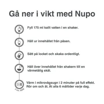 Tillsätt 175 ml vatten och 1 påse Nupo i en shaker. Skaka ordentligt och häll i en skål. Värm i ca. 2 minuter i mikrovågsugn. Kan också värmas i en gryta. Rör om och njut av alla 6 portioner per dag. Det är viktigt att följa bruksanvisningen.