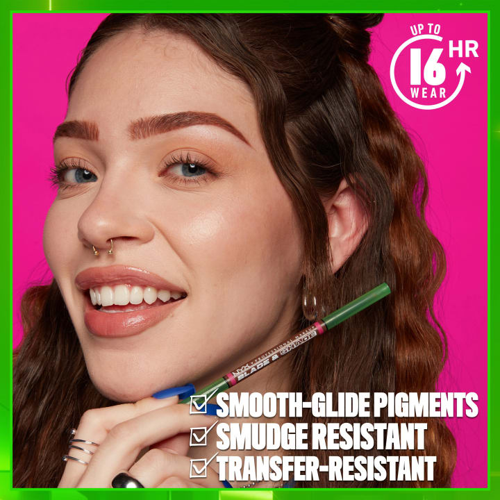 NYX Professional Makeup Blade & Shade är en ögonbrynspenna som ger ett salongsliknande resultat när du fyller i ögonbrynen hemma. Pennan har en unikt utformad spets som både har en ultratunn sida som används för att skapa hårstråliknande streck och forma ögonbrynen till önskad längd och bredd, och en bred sida som används för att skugga ögonbrynen och ge dem ett fylligare intryck. Resultatet håller i upp till 16 timmar utan att blekna eller smetas ut under dagen. Krämiga pigment som glider lätt över huden utan att fastna. Finns i 12 nyanser. 0,1 g.