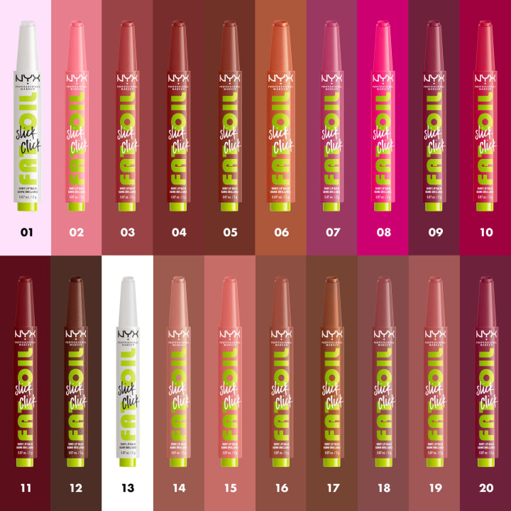 NYX Professional Makeup Fat Oil Slick Click är ett vårdande läppbalsam som ger en skir färg och diskret glans. Berikad med avokadoolja, hjortronolja och hallonfröolja som mjukgör och återfuktar läpparna i upp till 12 timmar. Lätt formula som känns mjuk och behaglig på läpparna. Läppbalsamet är förpackat som en praktisk penna som klickas upp i botten och ger en perfekt mängd att applicera på läpparna. Vegansk. 2,3 ml.