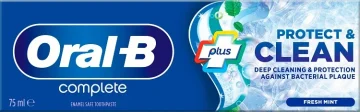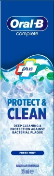 Oral-B Complete Plus Protect & Clean Tandkräm rengör på djupet och skyddar mot bakteriellt plack. Tandkräm som ger omedelbar fräsch känsla och hjälper tänderna att få tillbaka sin naturliga vithet genom att ta bort ytliga missfärgningar. Med uppfriskande smak av mint.