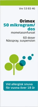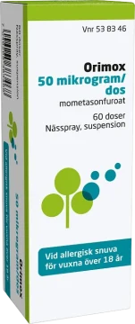 Orimox nässpray är ett receptfritt läkemdel som innehåller mometasonfuroat, en grupp av läkemedel som kallas kortikosteroider (kortison). Det kan hjälpa till att lindra inflammation (svullnad och irritation i näsan), nysningar, klåda, nästäppa eller rinnsnuva.