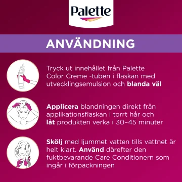 Användning: 1. Tryck ut innehållet från Palette Color Creme -tuben i flaskan med utvecklingsemulsion och blanda väl. 2. Applicera blandningen med applikatorflaskan i torrt hår och låt produkten verka i 30-45 minuter. 3. Skölj med ljummet vatten tills vattnet är helt klart. Använd därefter den fuktbevarande Care Conditionern som ingår i förpackningen.