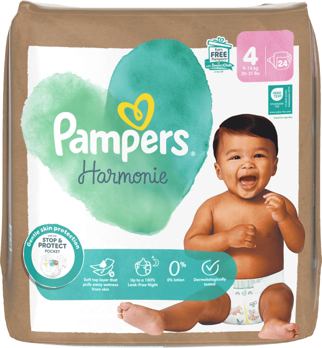 Pampers Harmonie är mjuka och sköna blöjor som är skonsamma mot barnets hud. Blöjorna garanterar torrhet i upp till 12 timmar och är utrustade med pampers urinindikator som gör det enkelt för dig att veta när det är dags att byta blöja. Storlek 4 passar barn som väger 9–14 kg. Pampers Harmonie är tillverkade av FSC-certifierad cellulosa och är certifierade enligt Standard 100 by OEKO-TEX. Innehåller 0% lotion. 24 st.