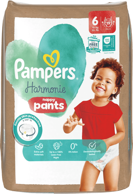 Pampers Harmonie Pants är skonsamma byxblöjor med en 360° passform som garanterar torrhet i upp till 12 timmar. Byxblöjorna är framtagna med en flexibel resår vilket gör att de är lätta att ta på och av. Storlek 6 passar barn som väger 15+ kg. Pampers Harmonie Pants är tillverkade av FSC-certifierad cellulosa och är certifierade enligt Standard 100 by OEKO-TEX. Innehåller 0% lotion. 19 st.