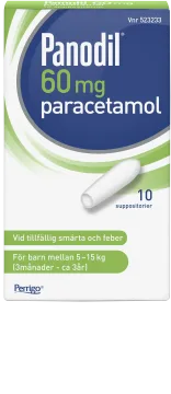 Panodil suppositorier innehåller paracetamol som är smärtlindrande och febernedsättande. Panodil suppositorier används för behandling av tillfälliga feber- och smärttillstånd av lindrig art, t ex feber vid förkylning, huvudvärk, tandvärk, menstruationssmärtor, muskel- och ledvärk. Suppositorier är lämpliga för feber och smärttillstånd vid sväljsvårigheter, illamående och kräkningar. Panodil suppositorier kan användas av personer med känslig mage eller magsår och personer med ökad blödningsbenägenhet. Du måste tala med läkare om symtomen försämras eller inte förbättras inom 3 dagar vid feber eller smärta. Använd inte Panodil till barn under 12 år i mer än 2 dygn om inte läkare föreskriver annat.