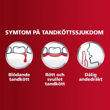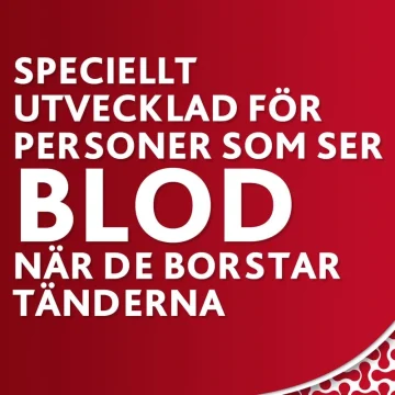 FÖLJ ALLTID BRUKSANVISNINGEN. Borsta två gånger dagligen och inte mer än tre gånger, minimera sväljandet och spotta ut. Kontakta tandläkare om symptomen kvarstår eller försämras, eller om det är barn med blödande tandkött. Avbryt användning om irritation uppstår. Tala med din tandläkare eller läkare så snart som möjligt om du upplever svullnad i munnen eller ansiktet. Inte lämplig för barn under 12 år. Förvaras utom räckhåll för barn. Använd inte produkten om förseglingen är bruten.