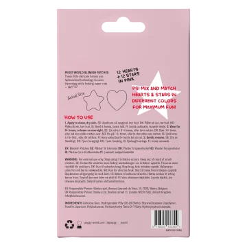 Peggy World Blemish Patches Hearts and Stars är hjärt- och stjärnformade hydrokolloidplåster utformade för att skonsamt ta hand om finnar och blemmor. Plåstren fungerar genom att absorbera överflödig vätska och orenheter från finnen, samtidigt som de skapar en skyddande barriär mot yttre påfrestningar. Detta hjälper till att minska synligheten av finnen och bidrar till en lugnare hud. De dekorativa plåstren kommer i form av 12 hjärtan och 12 stjärnor. 24 st.