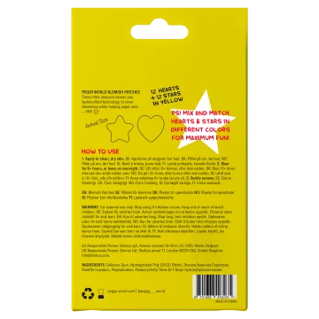 Peggy World Blemish Patches Hearts and Stars är hjärt- och stjärnformade hydrokolloidplåster utformade för att skonsamt ta hand om finnar och blemmor. Plåstren fungerar genom att absorbera överflödig vätska och orenheter från finnen, samtidigt som de skapar en skyddande barriär mot yttre påfrestningar. Detta hjälper till att minska synligheten av finnen och bidrar till en lugnare hud. De dekorativa plåstren kommer i form av 12 hjärtan och 12 stjärnor. 24 st.