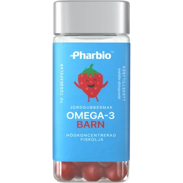 Pharbio Omega-3 Barn Kapsel är ett högkoncentrerat kosttillskott med omega 3. De små tuggkapslarna är speciellt anpassade för barn och har en god jordgubbssmak. En kapsel per dag bidrar till att tillgodose ditt barns behov av omega-3. Innehåller högkoncentrerad fiskolja med en särskilt hög andel av omega-3 fettsyran DHA. 70 st.