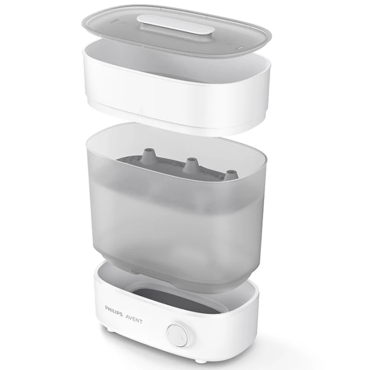 Philips Avent Elektrisk Sterilizator Avancerad är en smidig och rymlig sterilisator för nappflaskor och tillbehör. Steriliseringen är skonsam och helt kemikaliefri, endast ren ånga används i processen som dödar 99,9% av alla skadliga bakterier. Sterilisatorn är snabb och effektiv, den kan sterilisera upp till sex nappflaskor med tillbehör på endast 10 minuter och stängs sedan av automatiskt. Storleken är flexibel och kan anpassas till nappar eller tillbehör som tar mindre plats.